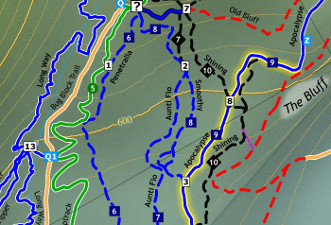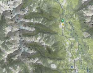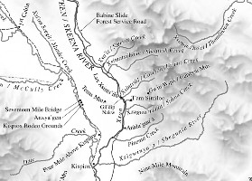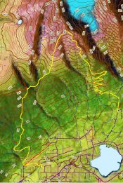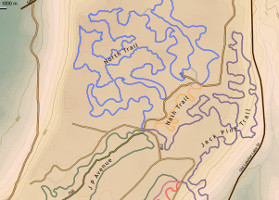 This is a detail of a trails map of the northeast slope of Hudson Bay Mountain, at the edge of town in Smithers, British Columbia. The bottom layer in this map is a 1 metre orthophoto mosaic produced for the BC Forest Service. The chief challenge in the map was selecting colours that would show up well against this background of various values and hues. |
