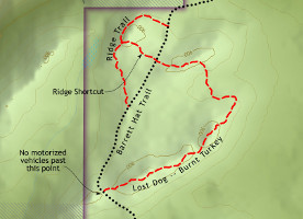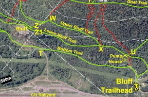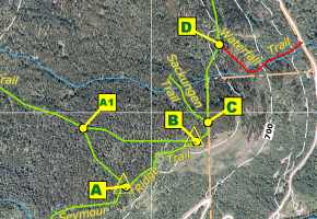 This is a detail of a trails map for the Community Forest just outside Smithers, British Columbia. These trails interconnect at several points with the Northeast Slope Trails (see below). Labels indicate letter signs posted at trail intersections |