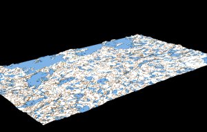 The image at right shows a portion of the Northwest Territories—a small slice of NTS Quad 76D. The 3D view was generated by MicroDEM, a piece of software that is specifically geared to displaying digital elevation model data. The DEM data came from CDED at geobase.ca, and the topographic raster overlay came from toporama.ca. |