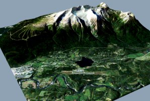 This image shows Hudson Bay Mountain, in British Columbia, and the valley on its southeast side. I created this 3D scene using 3DEM, one of the best pieces of presentation software for digital elevation models (DEMs). The DEM data was from CDED (Canadian Digital Elevation Data) available free from geobase.ca, and the orthorectified satellite image came from toporama.ca. |
