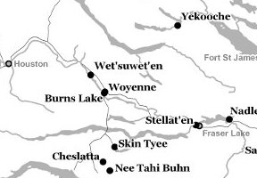 This black-and-white map, for a journal article, locates thirteen First Nations communities within the Carrier-Sekani Tribal Council in central British Columbia.