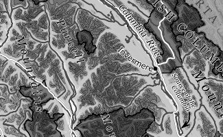 Two maps of the Columbia River Basin (as it was in 1800, and in 2012) for a publication of the Kelowna Art Gallery to go along with their exhibit of watercolours by John Hartman. |