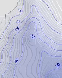 These bathymetry contours, overlaid on a shaded image of a lake bottom, were generated from a set of spot depths. I used GRASS to interpolate a surface from the spot depths, and then to generate contours from that surface. I produced the background image using 3DEM, and displayed the contours over it using dlgv32pro. For a lake outline I used Lake Kathlyn, British Columbia. The spot depths were fictitious. |