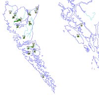 The image at right shows the Queen Charlotte Islands and the adjacent coast of British Columbia. It was done with MapInfo. Like ESRI's ArcView, MapInfo is geared to displaying geographic features that are associated with tables of data. The data here are the drainages layers (15, 16 & 17) of the BC portion of the National Atlas of Canada, 1:2,000,000, from geogratis.ca. |