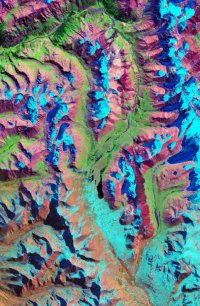 This is an image of the Tien Shan Mountains in Kyrgyzstan, Central Asia. I used GeoExpresss View to extract this small image from a MrSID file. GeoExpress View is the free MrSID viewer from Lizard Tech, and has elegant tools I have seen for zooming and panning in MrSID images. It also allows you to save any subportion of the image as a GeoTiff file. The data is from NASA's Geo Cover product, downloaded from the NASA Earth Science Applications Directorate. |