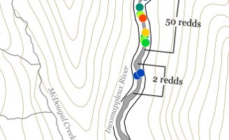 A fisheries biologist walks a river looking for the redds (or spawning beds) of bull trout, and then files a report on what was found. These maps were prepared as figures for one such report, which concerned bull trout in creeks flowing into the Upper Arrow Lakes reservoir near Revelstoke, BC. |