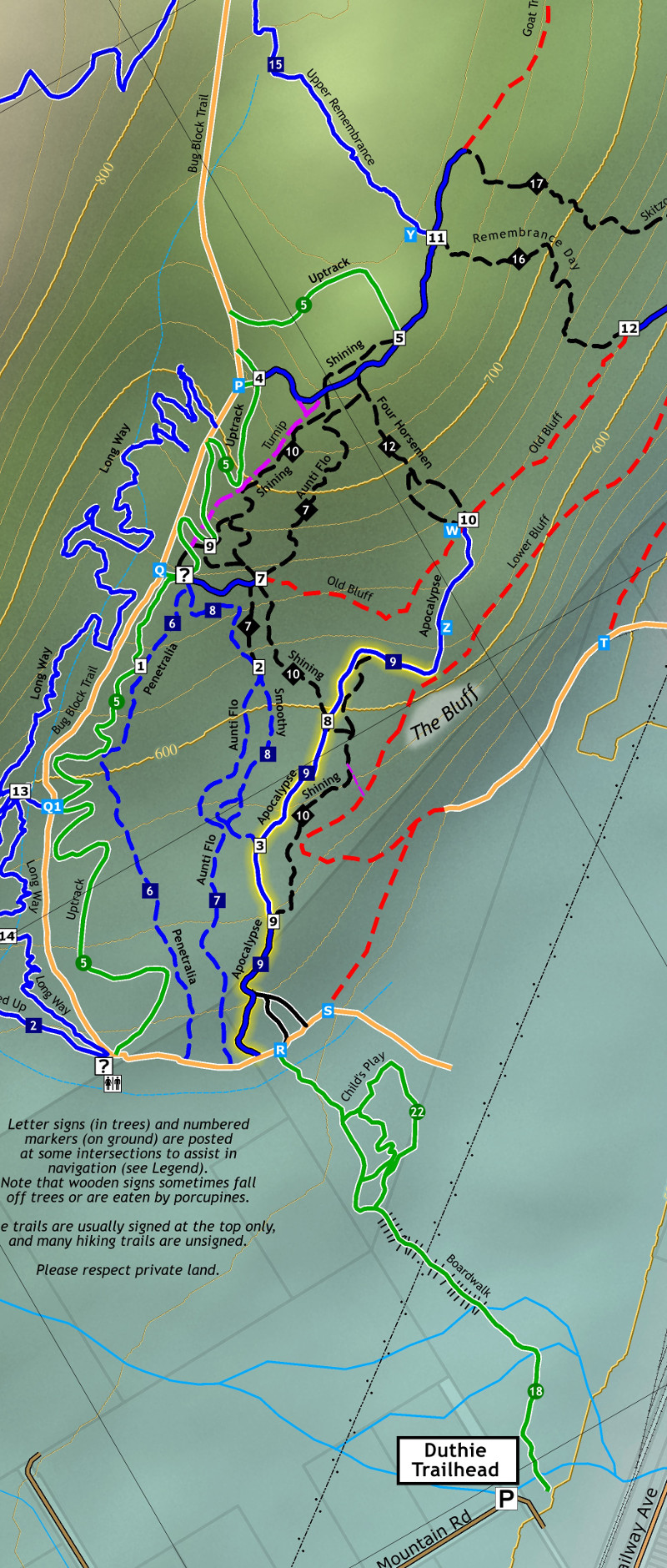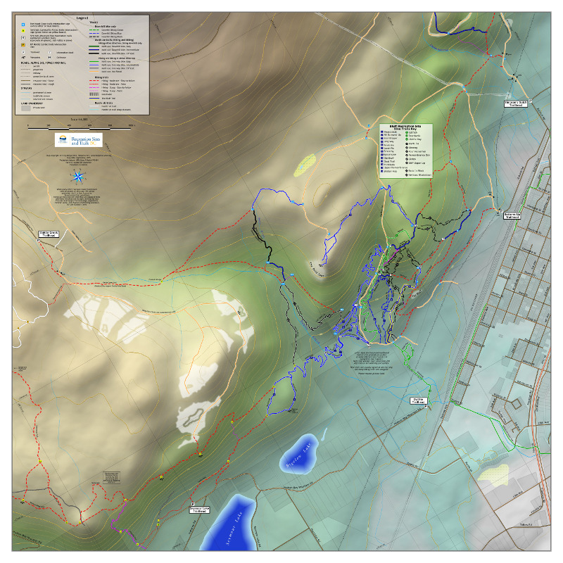 I also went for a kind of a "subway" map look, in that trails are mostly bounded lines -- suggesting that once you get on a trail you're on it to the next intersection. The bike trails are of course rated into difficulty levels, while the hiking trails have different considerations (moderate vs. steep, easy-to-follow vs. faint). The scale of these maps is 1:6,000, which, by my general rule, means I would need a DEM with a cell size of 60 cm to generate the shaded relief. Well, that would be nice, but I didn't have anything even remotely that good. I used the SRTM DEM, whose cell size is somewhere in the 20m range, and then resampled it down to 3m. I denoised it in GRASS, and then built my hillshade from that. It's too coarse for this scale, but it works as a general suggestion of the landforms. (Can imagine though how good a 60cm DEM would look?) One of the great things about making these maps was that I improved my trails data significantly, both through receiving GPS tracks from other people and from walking and GPSing the trails myself. |