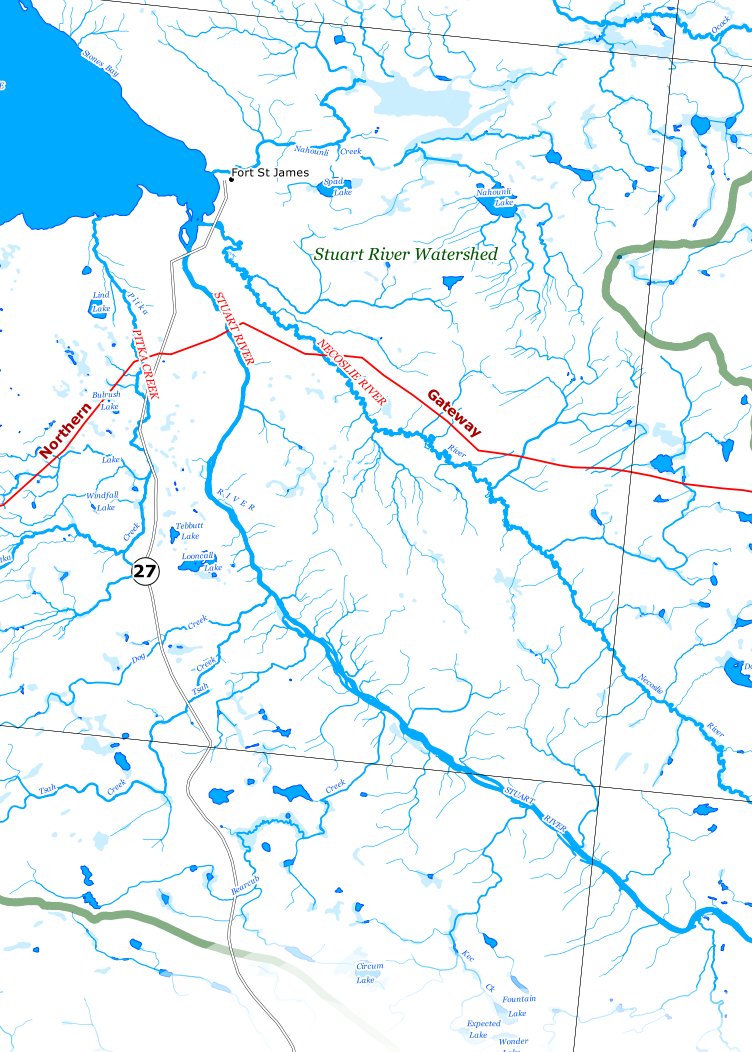 The 4000 Reasons Festival was held in Smithers on June 6th, 2012, to celebrate the 4000 people in British Columbia who signed up to speak to the panel reviewing Enbridge's application to build the Northern Gateway Pipeline. The Driftwood Foundation asked me to prepare this map for the festival, a map showing all the named and unnamed waterways in BC that the pipeline would cross. The full map (only a small detail is shown above) is 66.04cm (26") high and 424.1.80cm (167" or 13' 11") long. At 1:150,000, it is more detailed than the six or seven 1:250K topos it would take to cover the same area. (Download complete map image at 100dpi -- 5MB) The streams and rivers shown on this map come from a provincial data set called the 1:50,000 Watershed Atlas. It can be downloaded from BC's Land and Resource Data Warehouse (LRDW). To keep the map focussed, I restricted the waterways to those within 25km of the proposed pipeline - beyond which they fade away. In this dataset every piece of every stream has been assigned a "stream order" number from 0 to 6 that expresses how far downstream in the water network it is. Streams of order 0 are at the top of the watershed; they combine to form streams of order 1, which combine to form streams of order 2, and so on. I used the stream's order as a thickness multiplier for the basic blue line, so as we work our way downstream on this map, it gets thicker. Like the 1:50,000 topographic maps and the 1:20,000 TRIM maps, the Watershed Atlas does not know the names of most of the waterways in BC. Other data sets, such as the Corporate Water Base and the Freshwater Atlas are similarly spotty on naming. The route of the proposed pipeline is from a Google