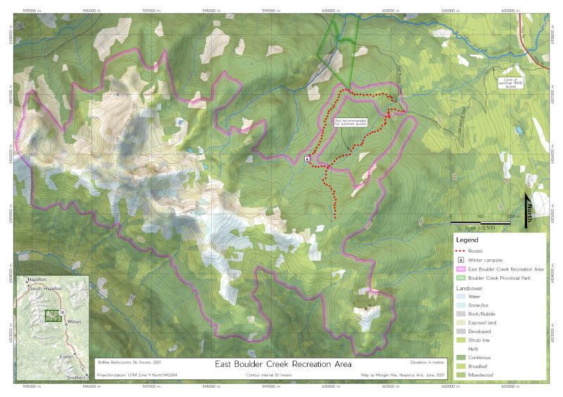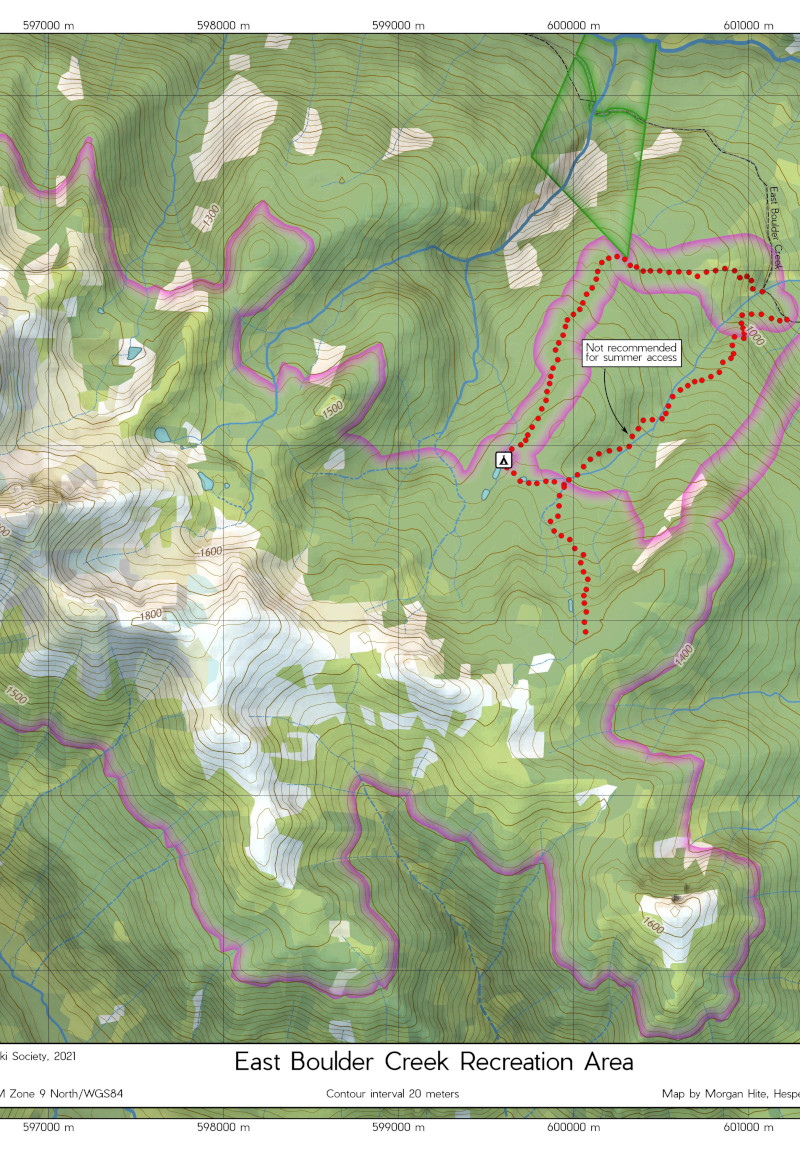 The recreation area is a polygon sent to me by the Society, along with GPS tracks for the two ski routes, and a GPS point for the winter campsite. Contour labelling is automatic. You'll find a link to it at https://bbss.ca/east-boulder-creek/. |
