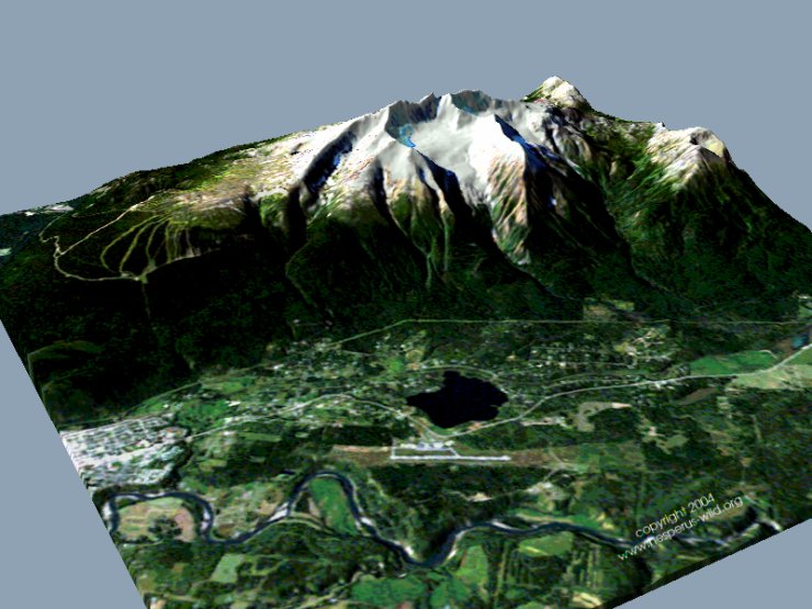 This is not a photograph! This 3D scene was generated by 3DEM, using a Landsat 7 orthoimage overlaid on a digital elevation model from CDED. Hudson Bay Mountain (elevation approximately 2500m) is in the centre background,with Smithers, BC (elevation approximately 500m), in the lower left. The Smithers airport is in centre foreground, with Lake Kathlyn just behind it and the Bulkley River just in front of it. The road that snakes between the lake and the airport is Trans-Canada Highway 16. The prominent line across the base of the mountain is a powerline. The ski runs of Ski Smithers show up left of the peak. North is to the right in this image. The Landsat image is a true-colour composite of bands 1, 2 and 3, taken on 15 September, 2001. Projection is UTM Zone 9 N. |