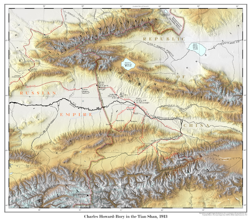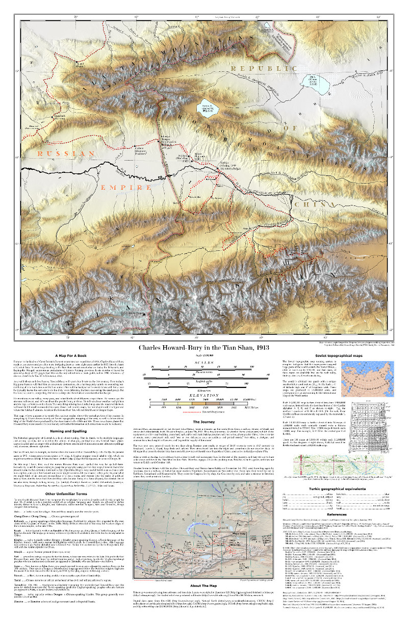 used book market. What I set out to do here was to resolve all the geographic references in the text. That is, you’re reading along, and he mentions the Yulduz plains or the village of Karachekinskaia, and you don’t know where that is. The various maps, atlases and website you can check don’t have it. So the book needs a supporting map. Pretty simple. But it evolved into something else. Initially I planned a 24?x24? sheet of paper, a size typical of folded maps that used to be glued inside the back covers of books. It would contain three maps. There would be a 1:1 million map detailing the central portion of his journey, the area where he spends the most time and mentions the most local details. There would be a 1:3 million map showing how he got from Semipalatinsk to Jarkent, the ten-day journey along Russian post roads for whose specific route he gives intriguingly few clues. Last, there would be a map at 1:7 million showing his exit route from Central Asia, from Jarkent to Tashkent, and then on by rail to the Caspian Sea. Then things happened which illustrate some general hazards about mapping for old books. The first map became the main project, and eventually pushed both other maps off the sheet. It’s what you see above. There were simply too many details to squeeze it in at a smaller scale onto part of the sheet. I let go of the idea that all the mapping one would need could fit into 24?x24?. I began building a hillshade of the area in Blender, and figured out an hypsographic colouring scheme inspired by an old Soviet topographic map of the area (?-44-?): low elevations are white, and then rise through oranges and brown to white summits. At the same time, as I tried to figure out just where Howard-Bury had gone, I found myself buried in old maps, wikipedia articles, and all sorts of other documents such as you get when you search on obscure terms like “Kuitun River.” I was reading maps in Russian and putting German websites through Google Translate. With each Aha! answer to a question, I felt more convinced that these puzzles — for the map had come to represent a series of puzzles — would make good stories. At this point the map became a poster, the bottom half of which contained explanations of stuff. Here’s the poster: |