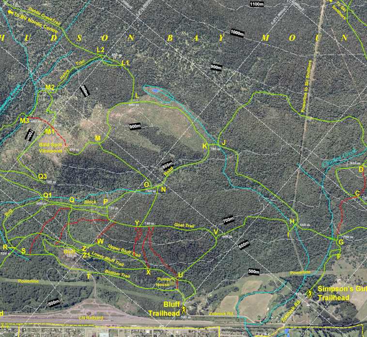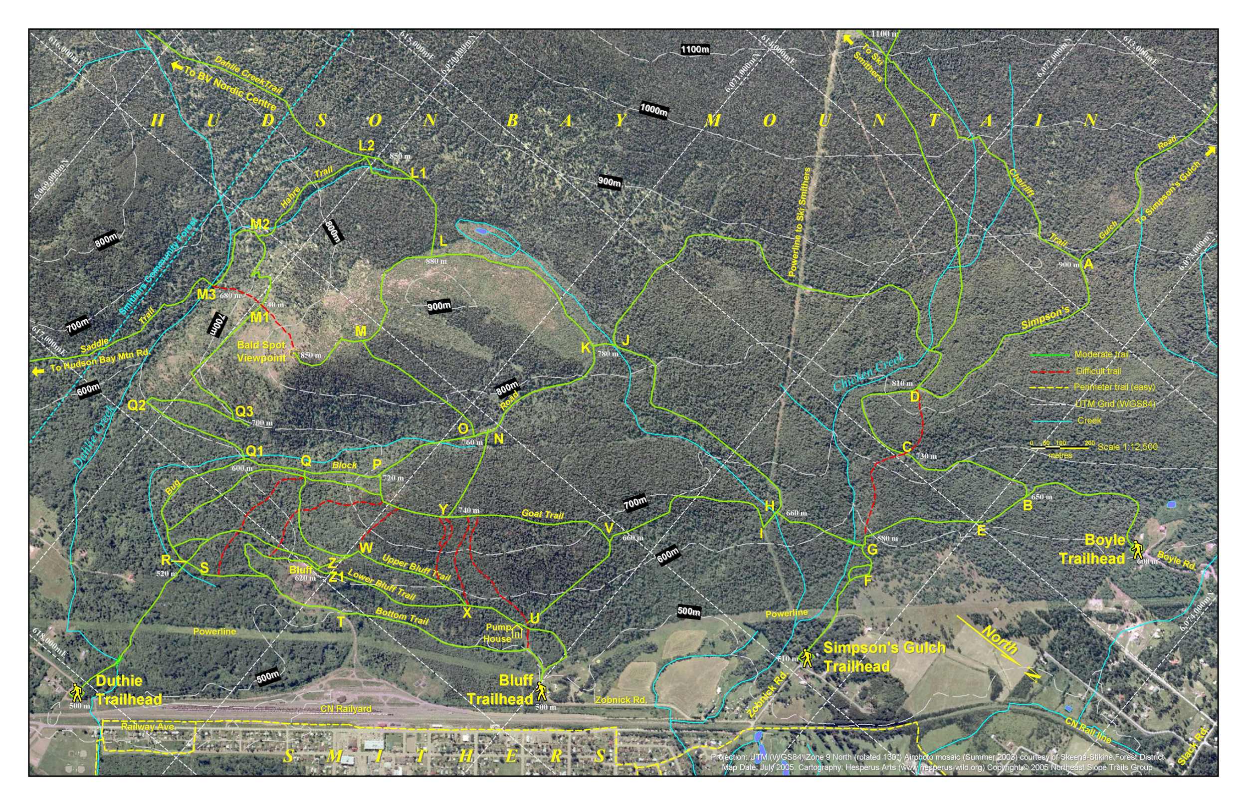 This map was designed for a 11" x 17" brochure format, at a scale of 1:2500. North was rotated to be to the lower right so that the town of Smithers would appear along the bottom of the map. The orthophoto is such a rich layer (even individual train cars are clearly visible) that it threatens to overpower anything else put over it (). Bright greens and yellow proved to be the most visible colours against the orthophoto, and shadowing was employed on text labels to help them stand out. A UTM grid was provided for GPS users. Projection is UTM Zone 9N (WGS84). view entire map as 11x17 PDF brochure Download the Google Earth KML file to view these trails. |