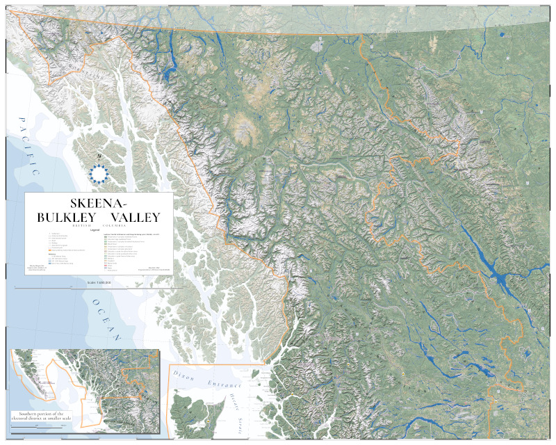 Finally, as shown above, I made a second version of this map for our Member of Parliament, Taylor Bachrach, who saw its potential to portray the entire electoral district he represents. This required an inset in the