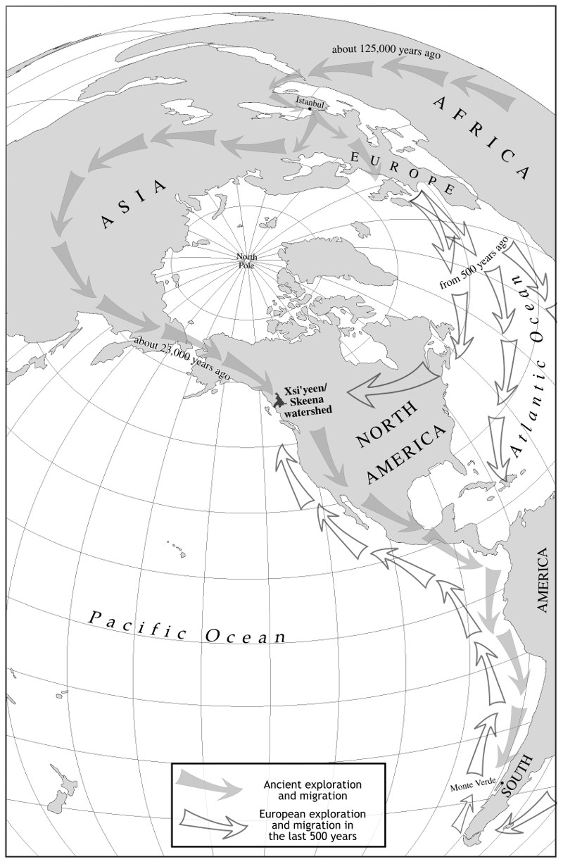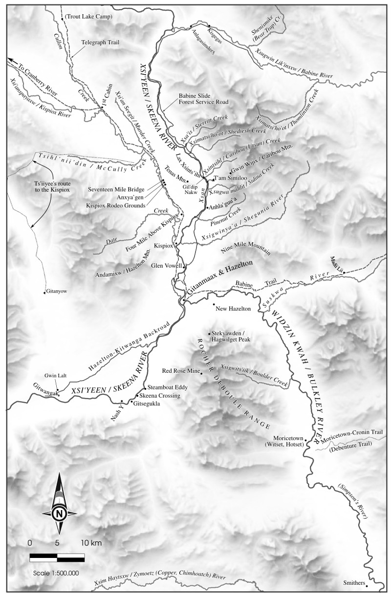 In 2016, Creekstone Press will be publishing Neil Sterritt's history of Hazelton and Gitanmaax, Mapping My Way Home. I was asked to do eleven maps for the book, and what an interesting collection of maps it was! As in the example above, many places in the traditional territory of the Gitxsan people have mutiple names. Sometimes the "official" (meaning gazetted) name is just a mangled version of the Gitxsan name (such as the Xsigwinya'a / Shegunia River). Other times there is yet another name based on a translation of the Gitxsan name (Xsim Haytsxw / Zymoetz River / Copper River). There were many sources for these maps, but one that really stood out was the set of maps Lou Skoda prepared for the Delgamuukw case. The eleven maps varied in scale from 1:8,500 (downtown Hazelton as it appeared in 1948) to 1:100,000,000 (the entire globe -- this one is shown below) -- and there were other maps at all sorts of scales in between. Organizing data was a project in itself, and data came from sources at many different scales. Every place mentioned in the text needed to be on a map, and in order to keep the maps uncluttered I made data layers that contained only the places mentioned in the text. It was a real privilege working with Neil and learning the details of Gitxsan geography through him. For many of these maps I used shaded relief generated in Blender, but I wanted to mask out relief details in valley bottoms, where most of the feature names would be. Using QGIS, I did this by placing the DEM (from which the shaded relief had been generated) over the shaded relief with a blend mode of Screen. I then styled the DEM as a smooth transition between solid black at 500m (pretty much the low elevation on the map) to solid white at 2000m (near the high end). The result was a shaded relief that "sticks up out of the fog" in the valley bottoms. |
