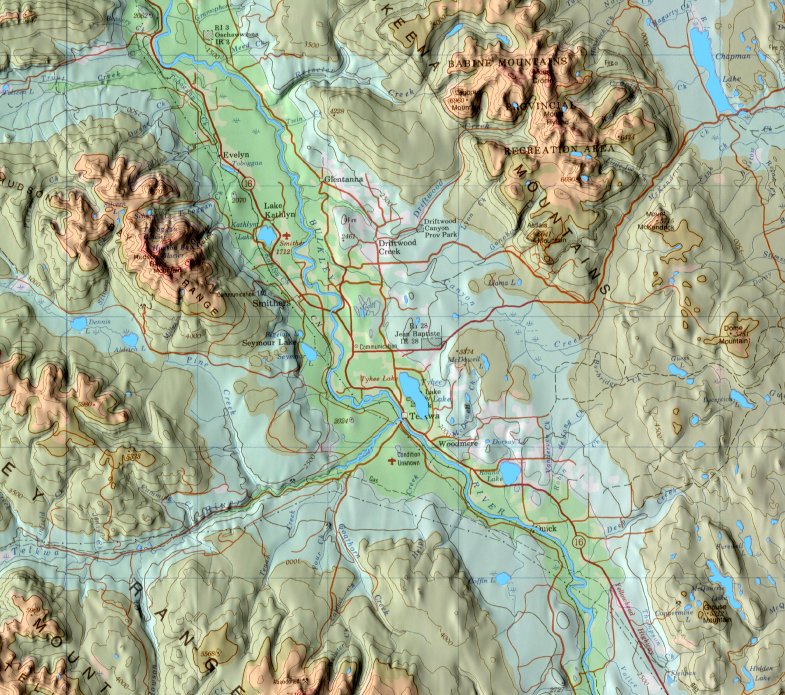 By re-processing existing, public-domain data, I produced a series of "VNC-like" 1:250K topos for the civilian air search-and-rescue group in Smithers (CASARA) to use as navigation maps. These combine the NTS 1:250K topographic base with the shaded relief and hypsometric tinting found on the 1:500K Visual Navigation Charts used by pilots. I begin with a CanMatrix image of a 1:250K topo map (downloaded from Geogratis) and overlay a semi-transparent layer of hypsometric (elevation) tints generated from a DEM for the same map (downloaded from Geobase). 3DEM generates the shaded relief. As a final step I overlay opaque waterbody polygons from NTDB data (also from Geogratis) in order to make lakes and ocean stand out more boldly. |