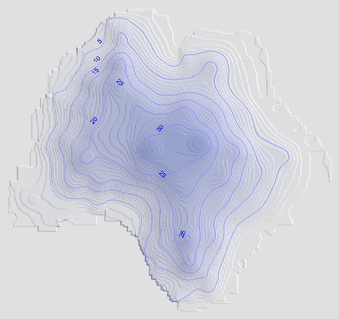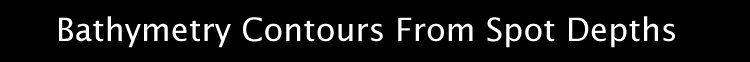 These bathymetry contours, overlaid on a shaded image of a lake bottom, were generated from a set of spot depths. Starting with a fictitious set of spot depths, and "zeros" along the lake shore, I used GRASS's s.surf.idw module to interpolate a digital elevation model (DEM) surface from the spot depths. (I first placed a raster mask around the lake to prevent the generation of spurious elevations outside the lake.) Then r.contour generated vector contours from that DEM. I exported the DEM as an XYZ ascii file using r.out.xyz, and the contours as ESRI shapefiles using v.out.shape. I preprocessed the XYZ DEM into a standard DEM format using using dlgv32pro, a.k.a. Global Mapper. I then viewed it in 3DEM to produce the shaded relief background image, placing the source of illumination in the south to create an illusion of depth rather than height. I then overlaid the contours on the background image using dlgv32pro. For a lake outline I used Lake Kathlyn, British Columbia. |