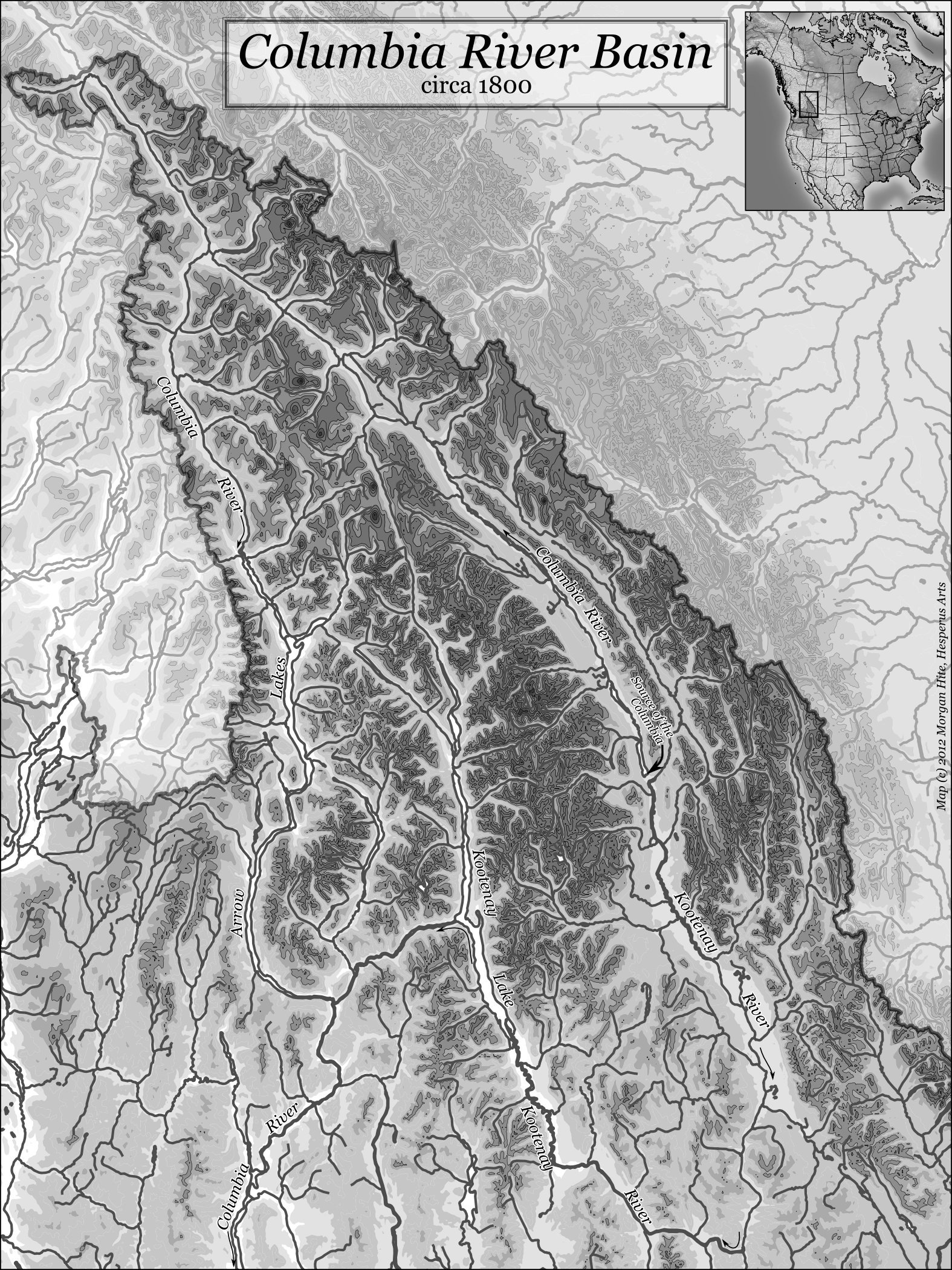 (Click on either image to see full-size.) In the fall of 2012, the Kelowna Art gallery mounted an exhibit of watercolours by John Hartman. UNBC Professor Sarah de Leeuw contributed an essay, Splittings: A Brief Geo-Scoial History of the Columbia River Basin, that appeared in a publication accomapnying the exhibit. For the essay, she asked me to make two greyscale maps of the Columbia River Basin. One map would show the area circa 1800, and the other would be contemporary. Only the later map would have the features that we have added to the geography since David Thompson first explored it in 1807 - 1811: