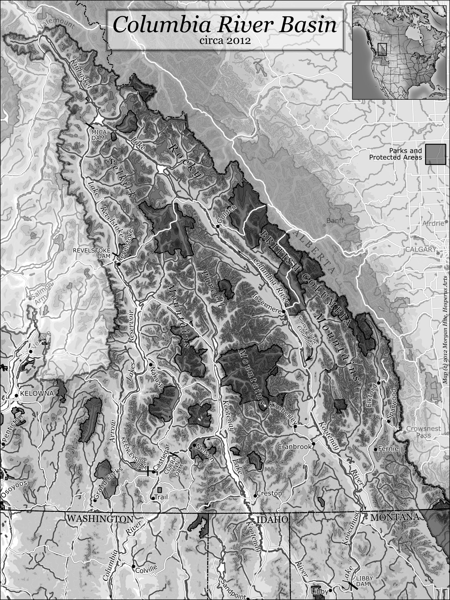 To fit on the page of the booklet, the scale would be 1:3,000,000. I assembled it in QGIS and added title, legend, inset map and labels in Inkscape. We defined the "Columbia River Basin" to be the upper Columbia basin, but not just the parts within Canada. The south edge of the map would be near the latitude of Sandpoint, Idaho. We also decided to include the basins of the Kootenay and Okanagan rivers, both of which join the Columbia fairly far down (from a Canadian perspective). It was in many ways an interesting challenge to find data that spanned the international boundary, or separate datasets that matched up well across the international boundary. Terrain relief came from the W140N90 tile of the USGS's gtopo30 data. I contoured it at 300m intervals with MapInfo's Vertical Mapper plugin, and displayed it with ten intervals of increasingly dark greys, from 0m to 4201m. Making the valleys light and the peaks dark made it easier to label the rivers. Rivers and lakes came from two pieces of data available at the Atlas of Canada's 1:1,000,000 framework data. For BC and the adjoining US states, I used the Pacific drainainge skeleton, which descends into the US and goes down the entire Columbia watershed. (On their website this is filed underr hydrology>analytical>drainange_network>pacific). On the Atlantic side of the divide, all the rivers visible on the map are in Alberta, so I used the cartographic data for Alberta rivers (hydrology>cartographic>ab). For the 1800 map, it was necessary to remove some man-made reservoirs from the Pacific skeleton data: Kinbasket Lake, Lake Revelstoke and Lake Koocanusa. I made a mask around the Columbia River Basin using the Atlas of Canada framework data's river basin data (Hydrology>Cartographic>Drainage Basins>River Basins) for rivers not draining into the Columbia. This was displayed as white with 50% transparency to fade features outside our area of interest. For the 2012 map, I added: