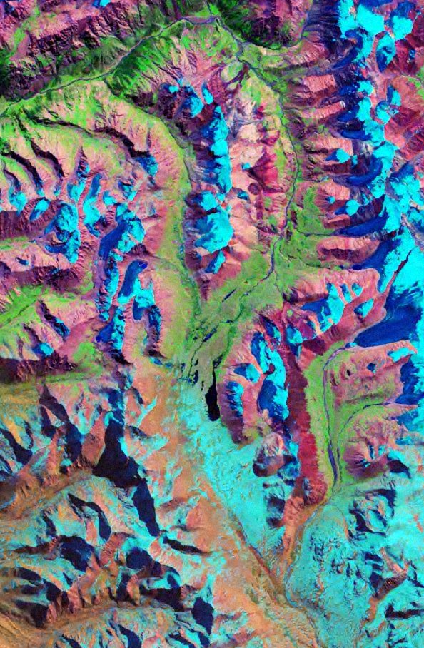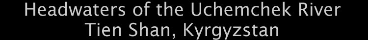 This image is a small subset of the NASA GeoCover MrSID tile "43-40," meaning UTM Zone 43, between latitudes 40° N and 45° N. The resolution of GeoCover images is 30 meters/pixel. The picture was taken in the 1990's, and has been rotated it so that North is to the left. The lake in the center is the headwaters of the Uchemchek River, which flows West (down) out of the picture. The Uchemchek eventually flows into the Naryn, a major river of Kyrgyzstan, and it in turn flows into the Syr Dar'ya. This location is at about 77° 30' E, 42° N, shown at a scale of 1:118,000. Peaks in the picture are at about 14,000' GeoCover is a short-wavelength infrared (SWIR) composite of Landsat 5 images. Landsat band 2 is displayed in blue, band 4 is displayed in green and band 7 (or 5) is displayed in red. For a nice explanation of Landsat images and bands, visit NASA's GeoCover tutorial. |