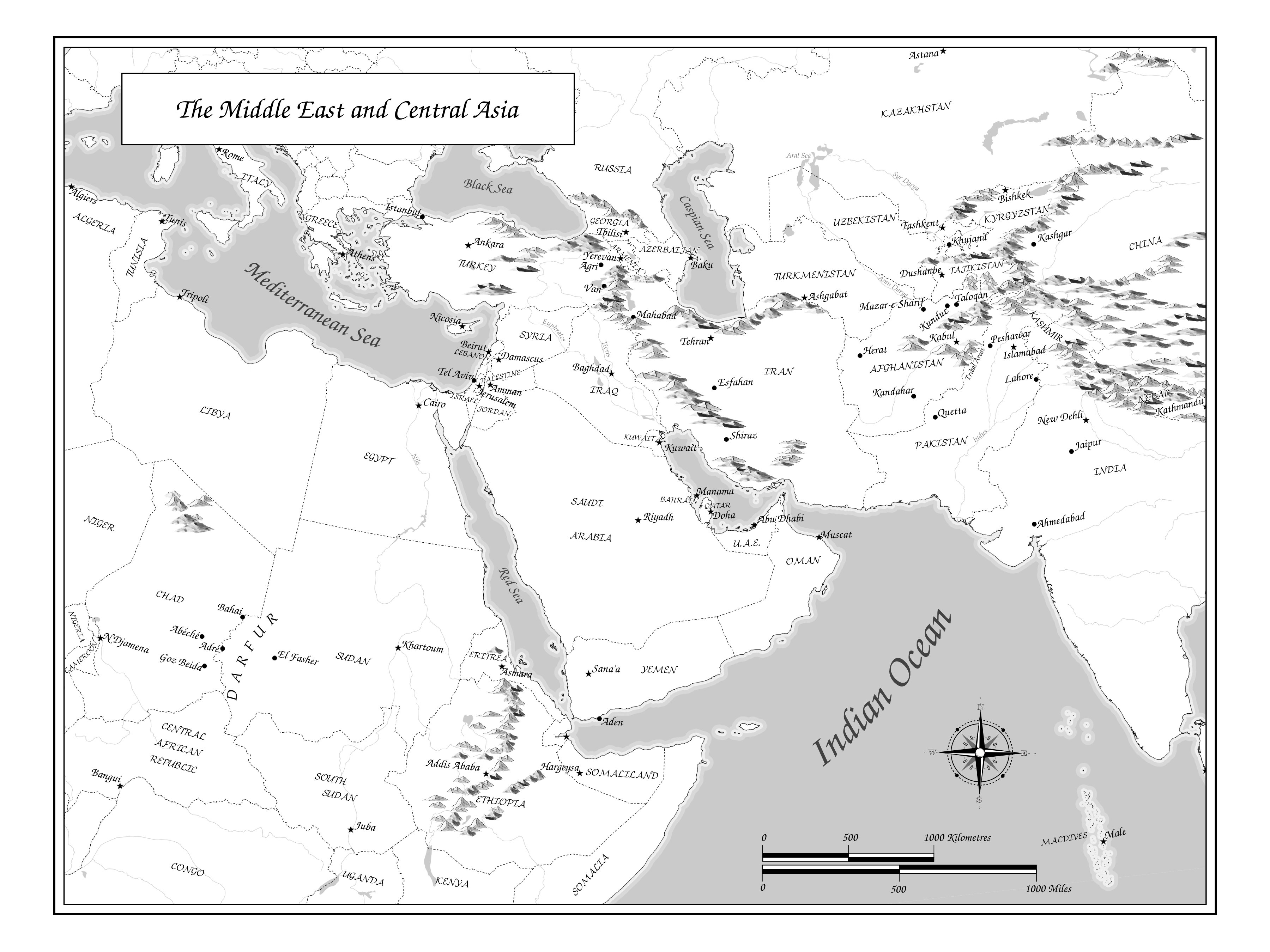 (click image to see full size) For his book Is This Your First War? Maclean's correspondent Michael Petrou needed a map of all the places he had visited in Central Asia. The map had to be greyscale, and we thought it should be framed to fit in a two-page spread of a book whose pages were 9" high and 6" wide. I had the enjoayable task of reading the manuscript, compiling a list of places mentioned, and then drafting the map. Michael wanted a travelogue-style map, so I put in some coastal vignetting, used a decorative font for placenames (URW Chancery L) and put in little hand-drawn mountains. The basemap was composed in QGIS, and the labels, decorative frame, title, compass rose, scale bar and mountains were added in Inkscape. In order to maximize the area of interest on the map (from Chad to Kashgar) I used a Lambert Conformal Conic projection with standard parallels 15° and 40° North, with origin at 52° 30' on the Equator. ("+proj=lcc +lat_1=40 +lat_2=15 +lat_0=0 +lon_0=52.5 +x_0=0 +y_0=0 +ellps=GRS80 +towgs84=0,0,0,0,0,0,0 +units=m +no_defs" for those of you wishing to re-create it). Scale was 1:24,424,342 Most of the data for this map came from from Natural Earth. International boundaries were the 1:10m "10m_admin_0_boundary_lines_land" layer. Coastal vignettes at 20km and 45km were buffered from the 1:10m "land" layer, and displayed as white and grey (216/216/216) respectively. "Ocean" was grey 202/202/202. Lakes and rivers came from the 1:50m "lake" and "rivers-lake-centerlines-with-scale-ranks" layers. Capital cities were selected from from the 1:10m "populated_places_simple_admin-0_capitals" layer, and other towns (e.g., Kunduz, Isfahan, Istanbul) were selected from 1:10m "populated_places_simple". Three small towns in Chad I digitized in via Google Earth. The mountains came from a