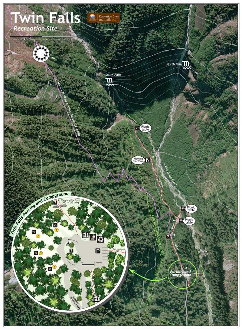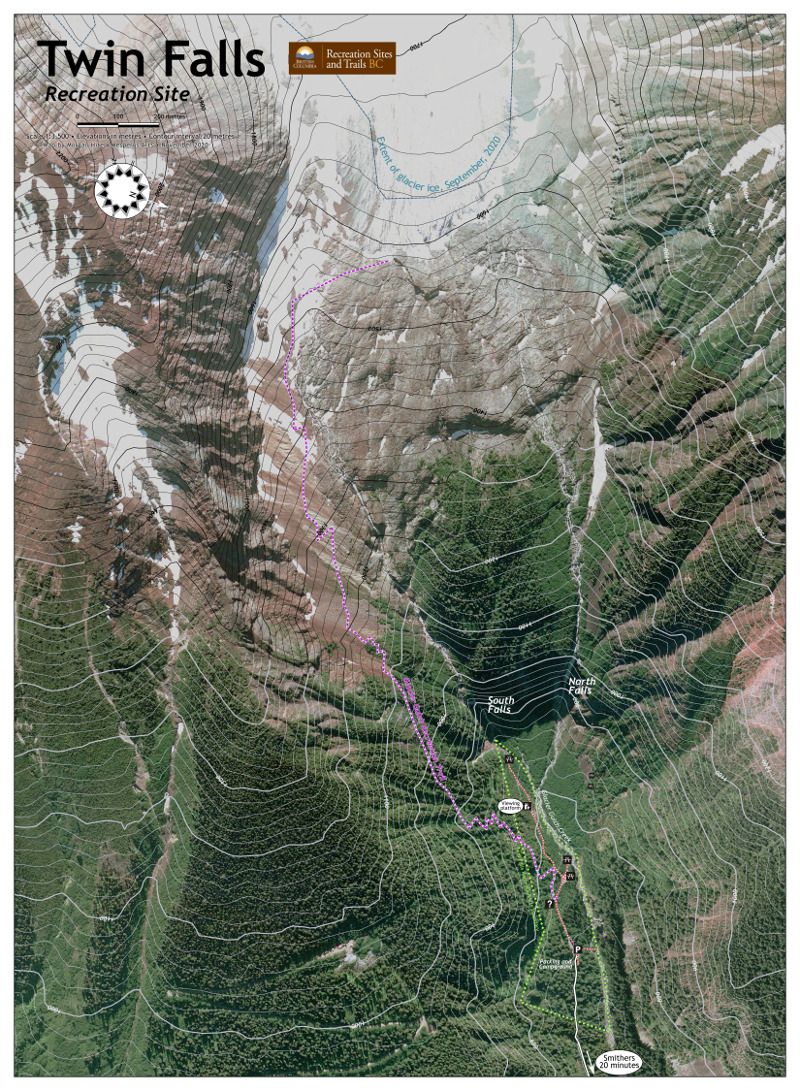 Twin Falls is the premier outdoor site to which Smithers visitors are taken, so it was an honour to be asked by Recreation Sites and Trails BC to prepare a new map for it. The map is 22 x 30", and therefore at the extremely large scale of 1:1,375. Fortunately good quality aerial photography was available in the form of the BC government's 2006 Natural Colour UTM 9 WMS service (https://openmaps.gov.bc.ca/lzt/ows). I displayed it at the bottom of the stack with -44 brightness and +47 saturation. It gives a nice sense of the depth of the site in its narrow canyon. The contour lines were generated from a 0.75" DEM downloaded from the Canada.ca Geospatial Data Extraction site. They are a bit oversized (0.3 mm and 0.8 mm thick) and a purply-grey (#bfbecf) so that they show up nicely over this saturated image. The Parking and Campground inset was constructed in Inkscape using SVG tree symbols from landscape architecture. I wanted to capture the heavy feeling of this wet forest where the sun rarely shines and cedar trees are side-by-side with giant spruces. The site lies in a narrow canyon running roughly east–west, with walls rising up to 800 metres on either side, so getting a good GPS signal in here is more or less impossible. I walked around quite a few times, measured things by pacing them out, and took photographs so that I could re-construct details later. I was there in early November, shortly before snow closed the road in. The maps features a north arrow/compass rose based on a twelve-pointed star. It sounds like it shouldn't work (compass roses are usually 16-pointed) but it's actually quite effective. A second map was also prepared, at 1:3,500, to show the greater area and the complete route to the glacier. |