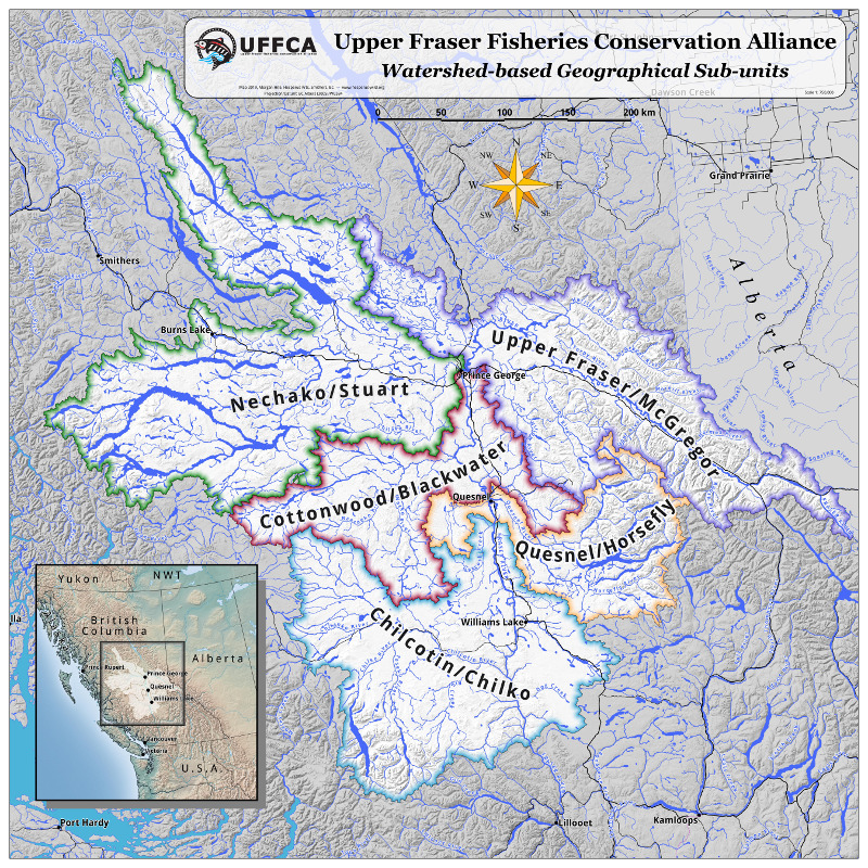 The Upper Fraser Fisheries Conservation Alliance works for the conservation and sustainable harvest of fish by its member communities, which are the Upper Fraser First Nations. This map, which is meant to show the sub-units of the organization, uses QGIS's inverted polygons styling to create a semi-transparent grey mask around the UFFCA area. Scale is 1:750,000. It uses the Atlas of Canada 1:1,000,000 scale national framework data for water features, and the provincial WMS hillshade (315°). The inset map (1:7,500,000) uses Tom Patterson's Natural Earth data, particularly the cross-blended hypsometric tints. |
