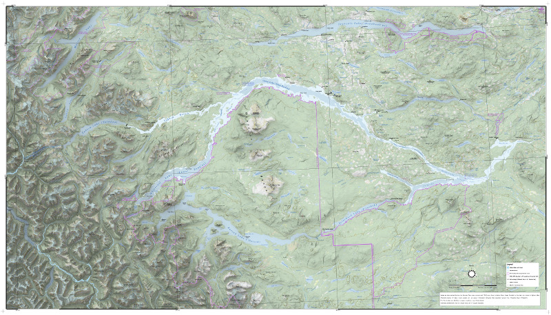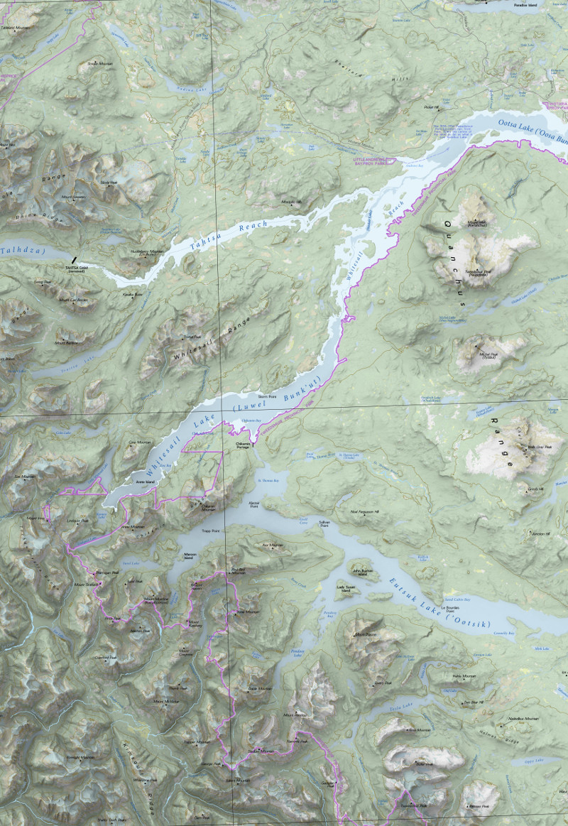 In 1952, ALCAN (the Aluminum Company of Canada) built an ambitious series of dams in order to supply its smelter in the coastal town of Kitimat, BC with the large amounts of electricity necessary to make aluminum. The plan involved damming an inland river named the Nechako, a river that flowed east out of the Coast Range, ultimately to the Fraser River and then down to Vancouver. Behind the dam water would back up almost to the coastal watershed, where Alcan bored a massive tunnel west through the Coast Range to convey water to its power plant close to the sea at Kemano. Behind the Kenney Dam, what were originally seven lakes along the Nechako—Natalkuz Lake, Intata Lake, Ootsa Lake, Sinclair Lake, Whitesail Lake, Tahtsa Lake and Tetachuk Lake—became one waterbody. Eutsuk Lake, slightly higher than its neighbours was not affected, and a plan to connect it into the system by digging a canal to nearby Whitesail Lake was never implemented. The Kenney Dam was not designed to allow any water to pass; instead Alcan built a spillway midway along the new reservoir, a spillway that would convey excess water over a low divide into a parallel river system to the north, the Cheslatta. Because of the sudden new high volume of flow in the Cheslatta, Saint Mary's Lake on that river system disappeared and simply became a canyon. First Nations sites were flooded, as were the farms of several Euro-Canadian settlers. Trees along the shore of the Nechako were not cut down, leading to the eerie and hazardous underwater forests for which these lakes are today famous. Some of the flooded area was inside the vast Tweedmuir Provincial Park (although park boundaries were changed as part of the project). Today, BC Parks and the Cheslatta First Nation are designing an interpretive sign to be placed on the shore of Ootsa Lake, at the small Wistaria Provincial Park, to tell the story of the lakes which are gone. I created the basemap for this sign, which is 70 inches wide and 40 inches tall. The map is at a scale of 1:130,000, and I used QGIS 3.14. |