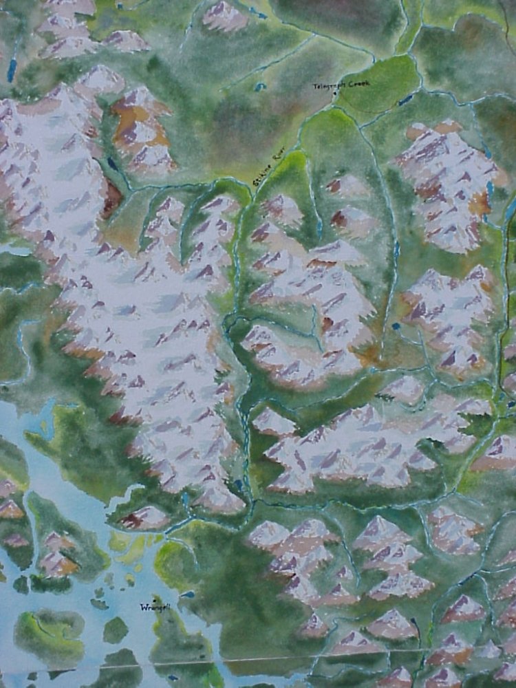 , showing the Stikine River connecting Telegraph Creek, British Columbia, with Wrangell, Alaska. The massive ice fields of the Coast Mountains dominate the map.